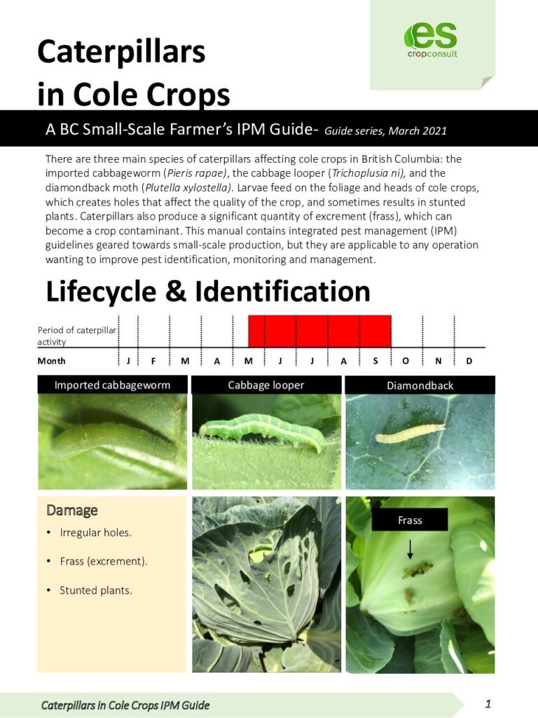 Three main species of caterpillars affect cole crops in BC: the imported cabbageworm (Pieris rapae), the cabbage looper (Trichoplusiani) and the diamondback moth (Plutellaxylostella). Larvae feed on the foliage and heads of cole crops, which creates holes that affect the quality of the crop and sometimes results in stunted plants.