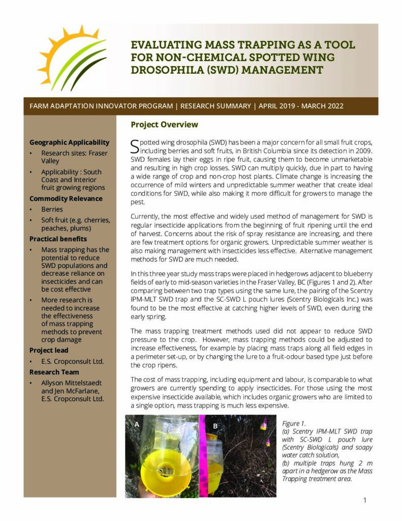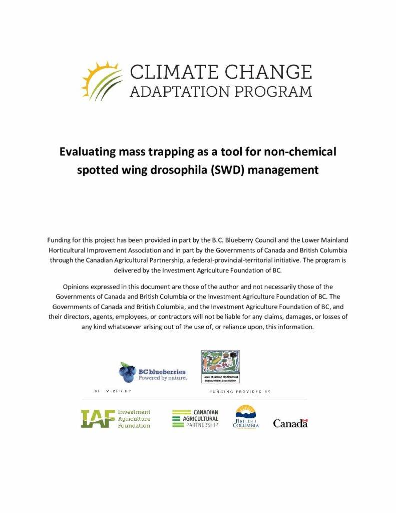 Spotted wing drosophila (SWD) has been a major concern for all small fruit crops, including berries and soft fruits, in British Columbia since its detection in 2009. Climate change is increasing the occurrence of mild winters and unpredictable summer weather that create ideal conditions for SWD, while also making it more difficult for growers to manage the pest.