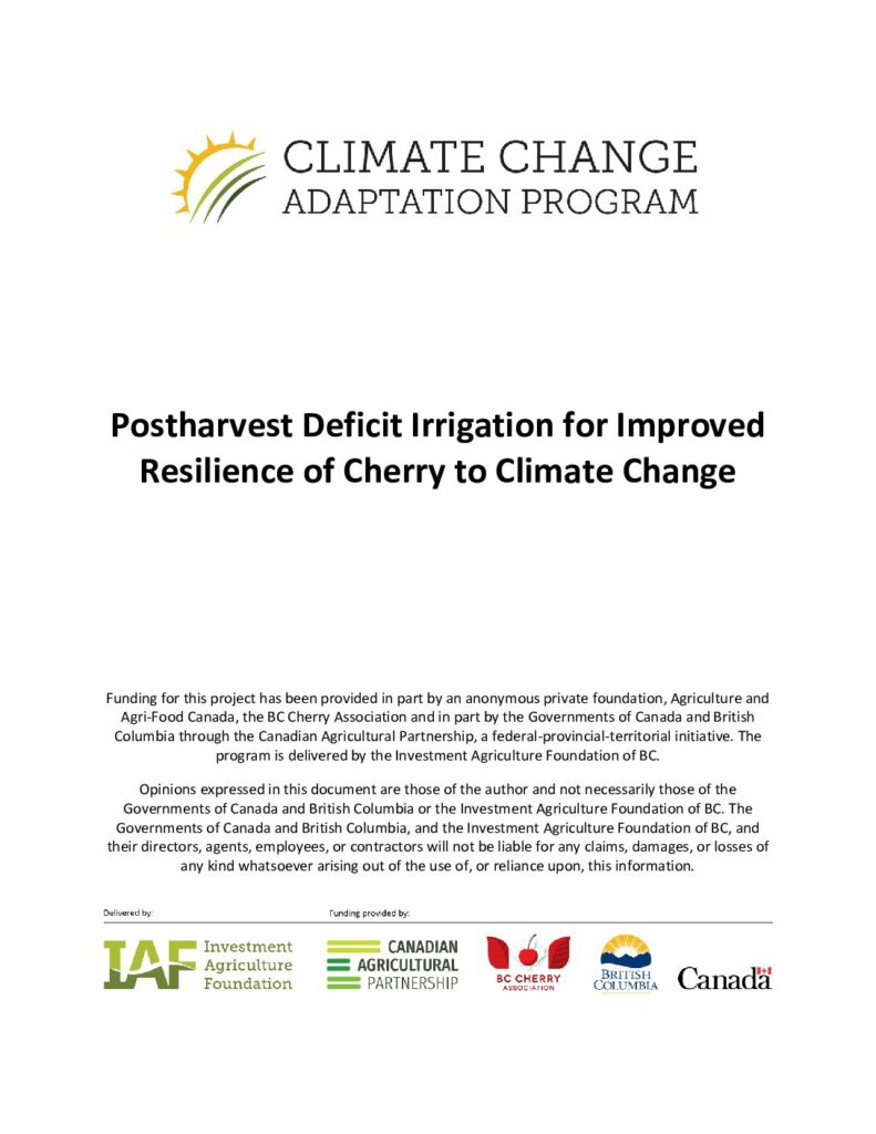 Postharvest deficit irrigation (PDI) is a strategy that can be used to reduce water demands in sweet cherry orchards and is a more sustainable irrigation strategy that will support agriculture resilience to climate change. Previous studies in this region have reported no change in plant physiology or tree growth with irrigation volume reductions of up to 25 %, postharvest. However, the effects of more severe postharvest reductions in irrigation volume were unknown.