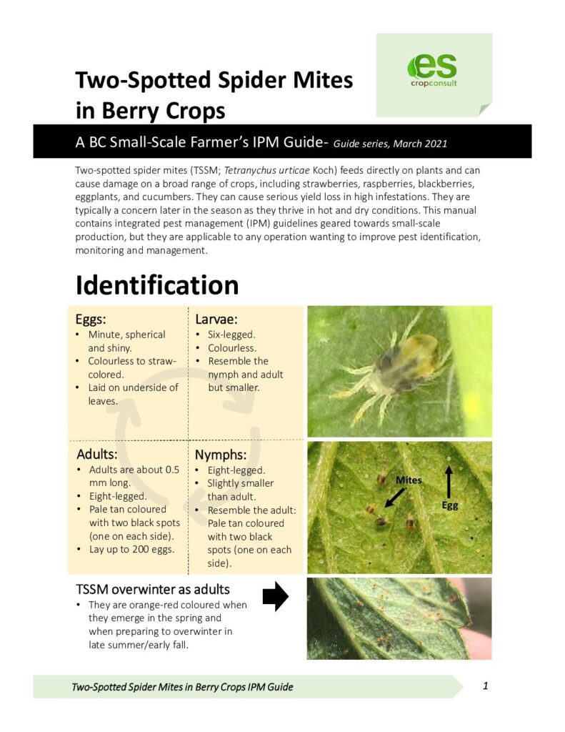 Two-spotted spider mites (TSSM; Tetranychus urticae Koch) feed directly on plants and can cause damage on a range of crops, including strawberries, raspberries, blackberries, eggplants and cucumbers. They can cause serious yield loss in high infestations.