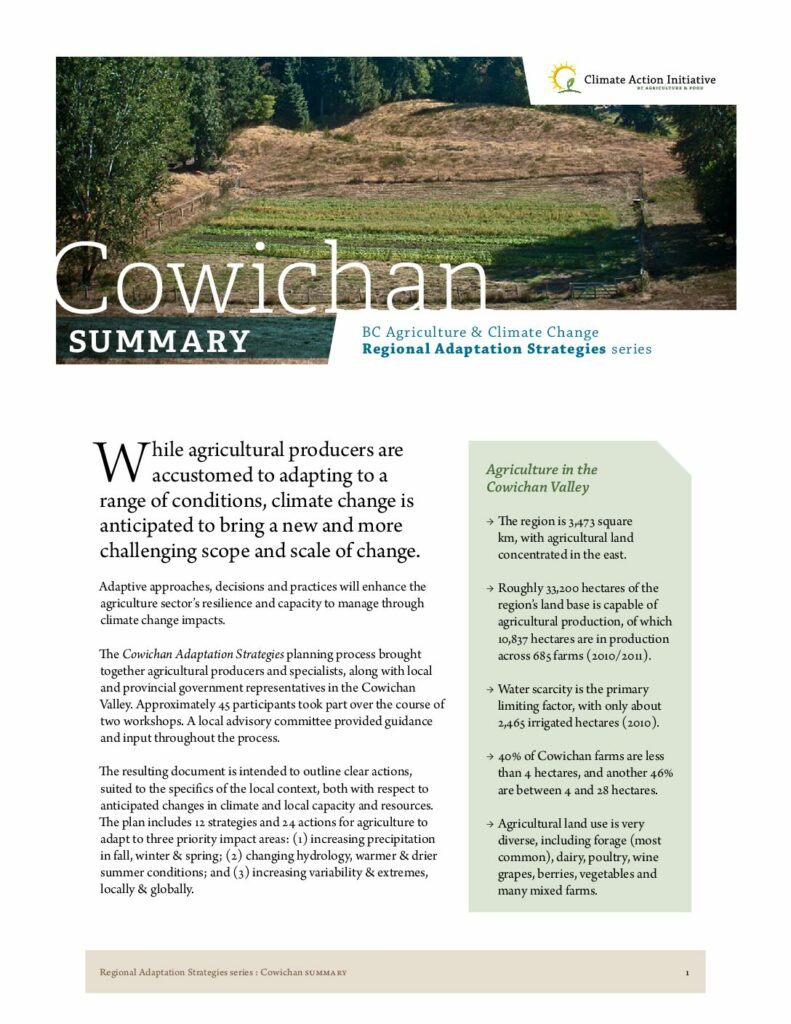 In 2020, the Vancouver Island Adaptation Strategies plan built on and updated the earlier work in the Cowichan. It encompasses the entire agricultural area of Vancouver Island, including the Cowichan Valley, and identifies 11 strategies and 32 actions.