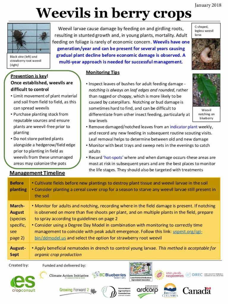 The first fact sheet focuses on weevils in berry cops and provides information on identification, monitoring and management. It includes information about seasonal management considerations, as well as how to distinguish between different species of weevils.