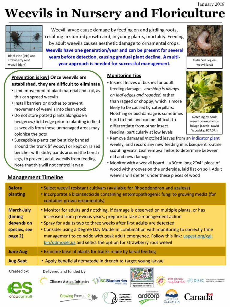 The second fact sheet focuses on focuses on weevils in nursery and floriculture cops and provides information on identification, monitoring and management. It includes information about seasonal management, as well as how to distinguish between different species of weevils.