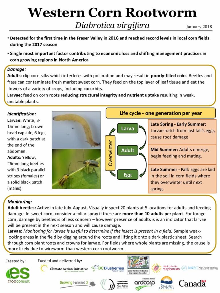 This fact sheet provides information on identification and monitoring. It outlines the lifecycle of western corn rootworm, risk factors that contribute to likelihood of presence of the pest, and suitable management practices.